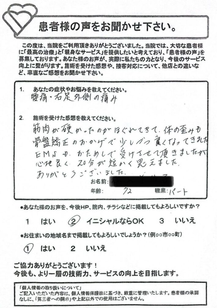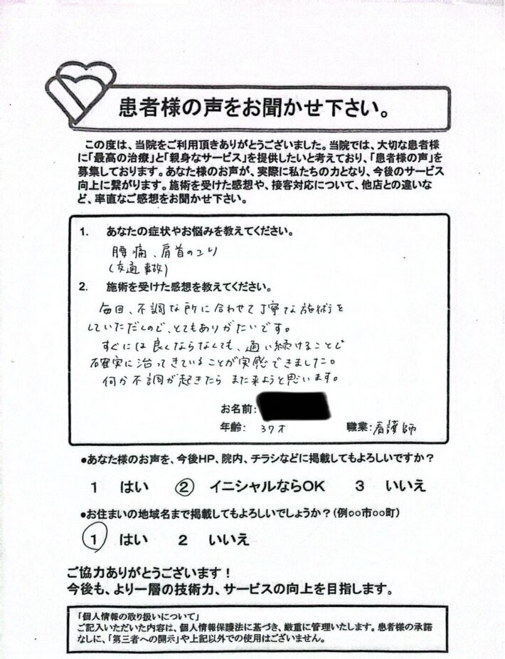 定期的に通院してもらい、腰痛と首の痛みが緩和していきました。