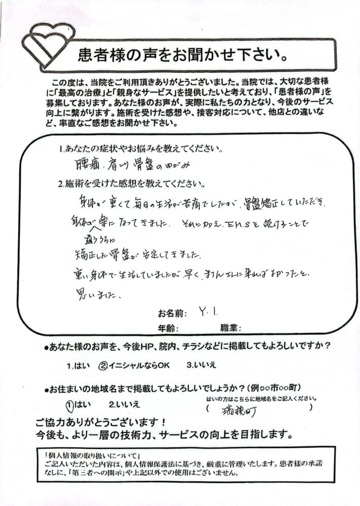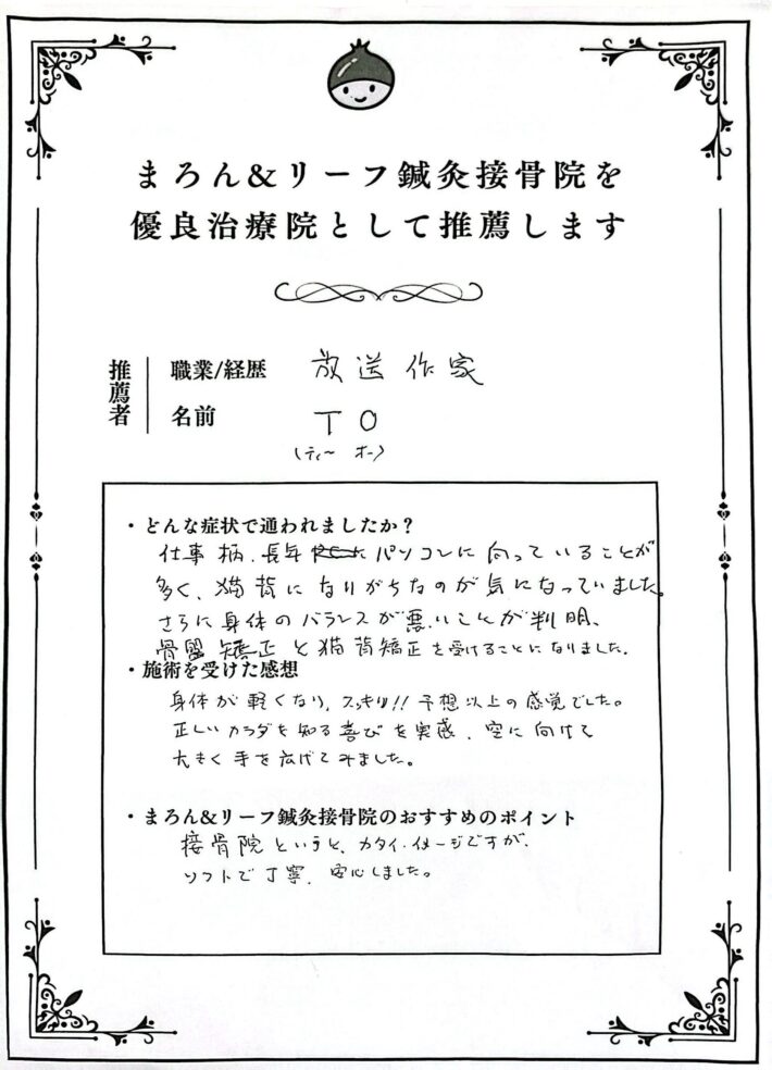 仕事柄、長年パソコンに向かっていることが多く、猫背になりがちなのが気になっていました。さらに身体のバランスが悪いことが判明。骨盤矯正と猫背矯正を受けることになりました